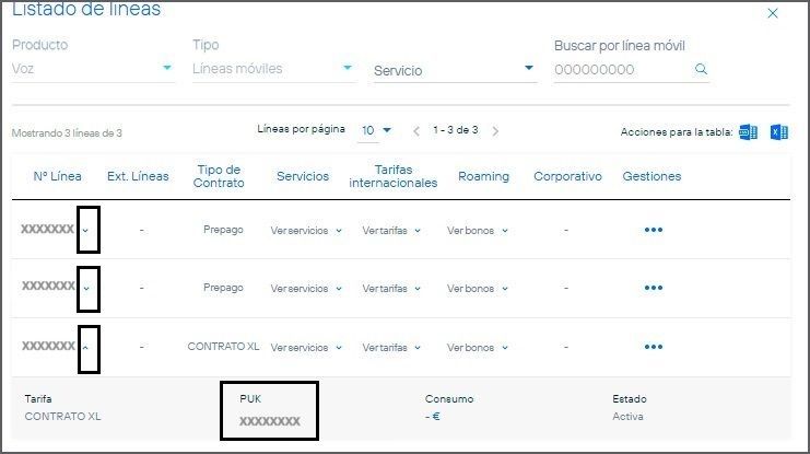 2.- Desde el listado de líneas móviles, desplegando la flechita que aparece junto al número de línea móvil.