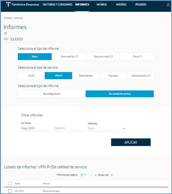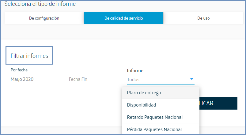 Posteriormente elige el tipo de informe que te interesa. En función del servicio pueden ser: