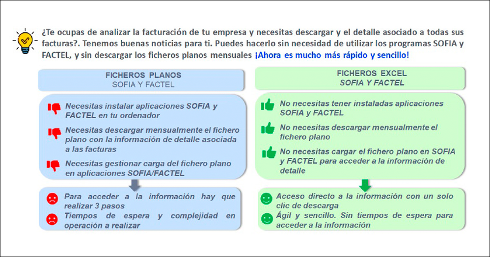 Una de las ventajas es disponer de acceso inmediato a la información de los informes de facturación, tan solo tienes que descargar el informe en formato Excel, sin necesidad de descargar el archivo de facturación, ni de usar el programa FACTEL y SOFIA.