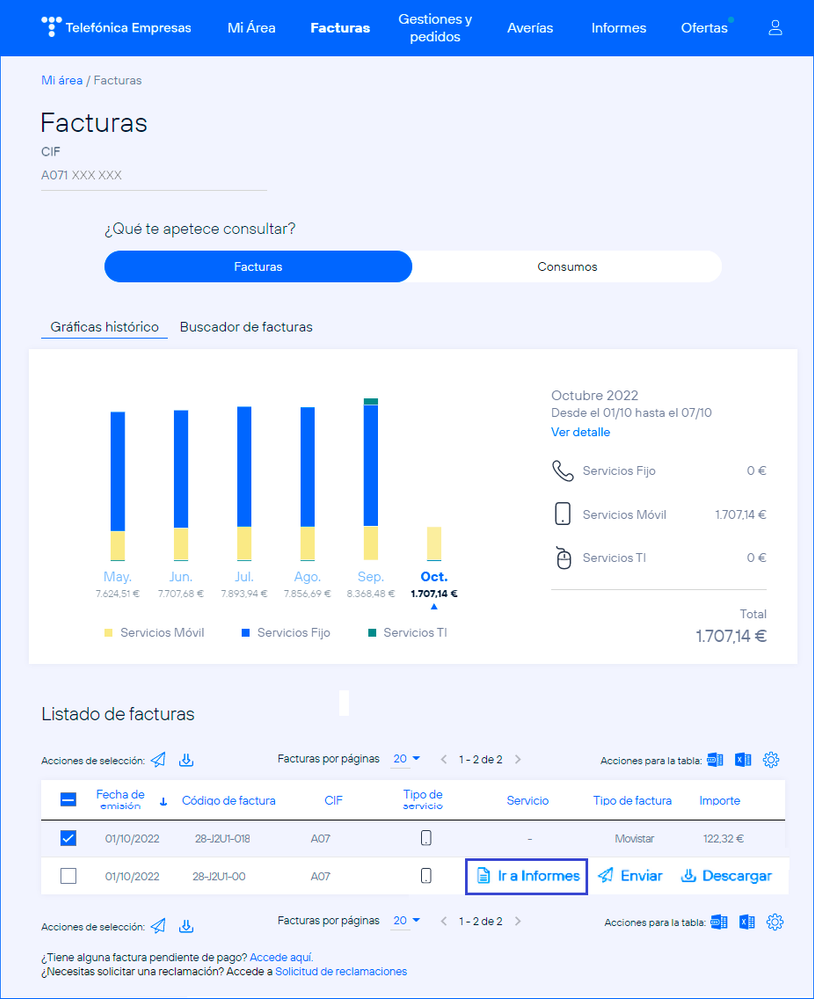 - Selecciona la factura que te interesa y pulsa en el icono 'Ir a Informes'