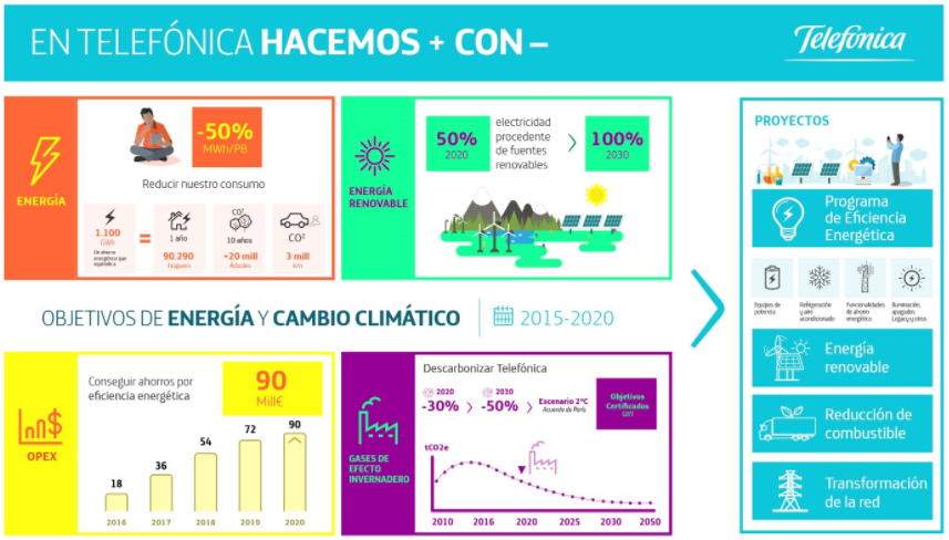 En este sentido, Telefónica se ha comprometido a desligar el crecimiento de su negocio del aumento de las emisiones de gases de efecto invernadero, disminuyéndolas un 30% en términos absolutos para 2020 y un 50% para 2030. En 2017, la compañía redujo sus emisiones un 28%, trabajando en un ambicioso Plan de Energías Renovables y se ha comprometido a ser 100% renovable en 2030. Además, la compañía trabaja en un Plan de Eficiencia Energética para reducir en un 50% el consumo de energía por unidad de tráfico.
