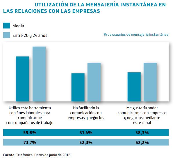 ¿Y en lo referente a la comunicación entre clientes y empresas? El informe de Telefónica señala que el 37,4% de los internautas se han comunicado con empresas y negocios por mensajería instantánea y al 38,2% le gustaría comunicarse con éstas utilizando la mensajería instantánea.