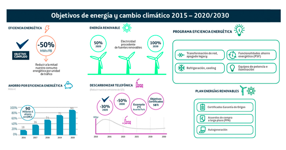 Y el pasado año en Telefónica conseguimos evitar la emisión de 1,4 millones de toneladas de CO2 gracias a nuestros servicios digitales, de modo que por cada tonelada que emitimos ahorramos a los clientes 1,2. Y nuestro objetivo es evitar en otros sectores 10 t de CO2 por cada tonelada que emitamos en 2025.
