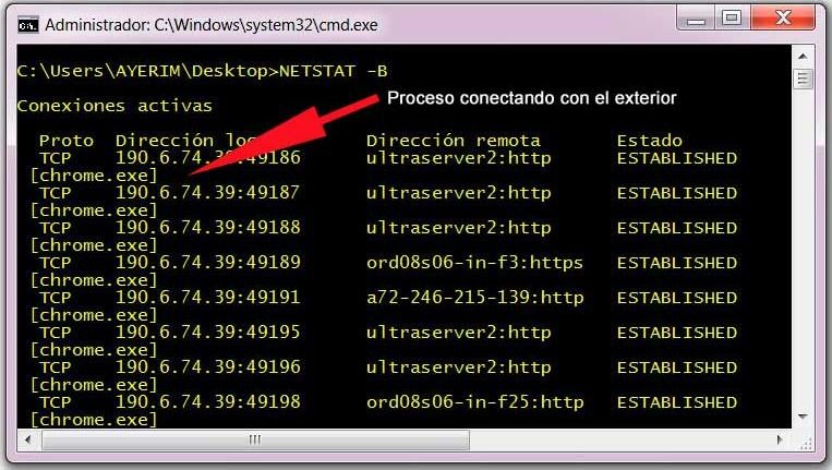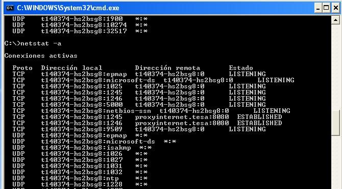 Si la realización de los pines es correcta, podemos utilizar otro comando de Ms-dos, para verificar las conexiones que tenemos establecidas. Con esta opción, podemos comprobar si tenemos algún programa ejecutándose en nuestro Pc, que pudiera cursar tráfico sin ser conscientes de ello.