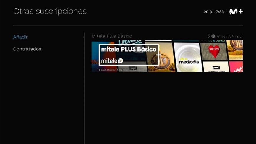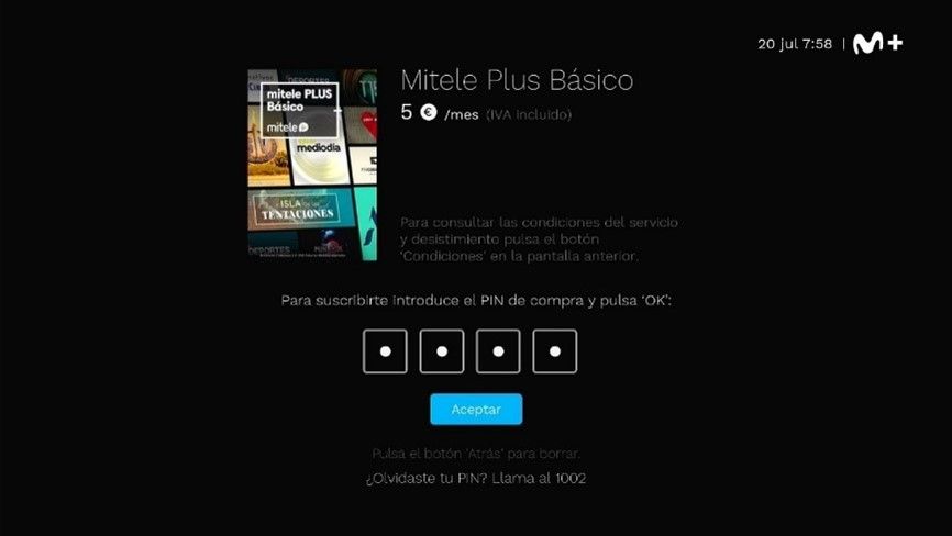 - Contratar de la suscripción mitele PLUS Básico a través del descodificador UHD, integrando la cuota mensual de la suscripción en la factura de Movistar.