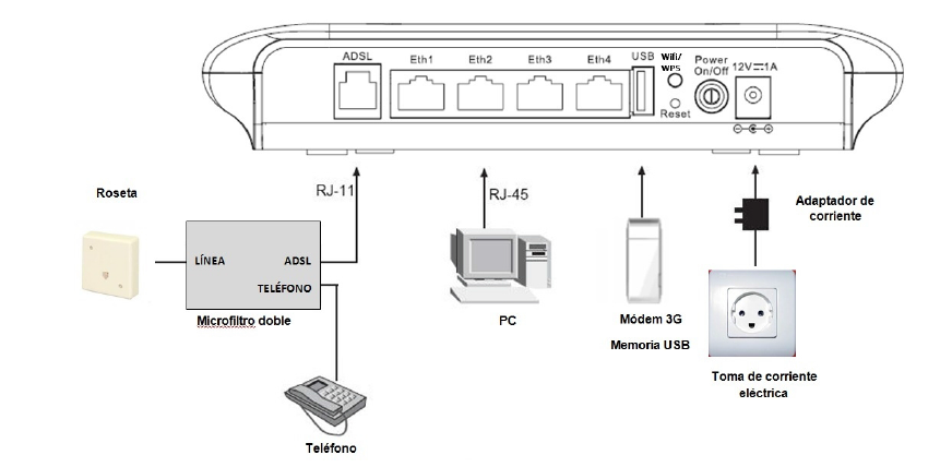 Básicamente, lo primero que necesitamos tener conectado el adaptador de corriente para poder alimentar el router. Después, un cable telefónico con conectores RJ11 conectado en la toma ADSL y, por el otro extremo, en la roseta telefónica para poder tener acceso a internet. Por último un cable ethernet con conectores RJ45 para conectar el router (Eth1-Eth4) y el ordenador para poder utilizar internet ó una conexión inalámbrica si utilizamos solo la conexión por WIFI.