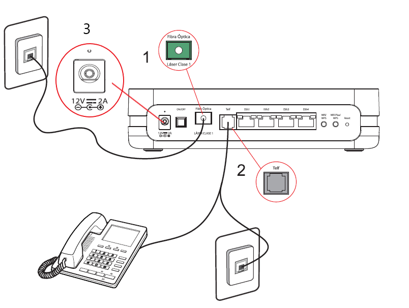 Básicamente necesitamos tener conectado el adaptador de corriente para poder alimentar el router (3). El latiguillo de fibra óptica para obtener servicio desde la central (1). El cable telefónico conectado al terminal TEL para acceder al servicio telefónico desde un terminal telefónico analógico o alimentar nuestra red interna de rosetas telefónicas (2).