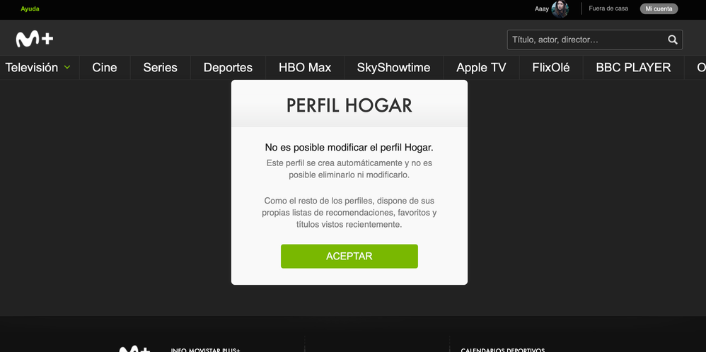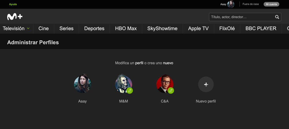 Procedi a llamar al 1004 y me cambiaron el usuario y contraseña, puse un correo diferente cambie la contraseña y entre de nuevo pero los perfiles salían exactamente igual. El perfil Aaay con esa foto que aparece en esta captura era antiguamente el perfil por defecto Hogar sin foto (repito es un perfil que no se puede editar)