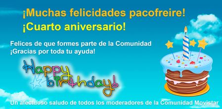 PabloS-MovistarAntiguo Moderador07-11-2016¡Felicidades Pacofreire! ¡4 años con nosotros! ¡Grande pacofreire! Celebramos que ya son 4 años en nuestra familia Mostrar más