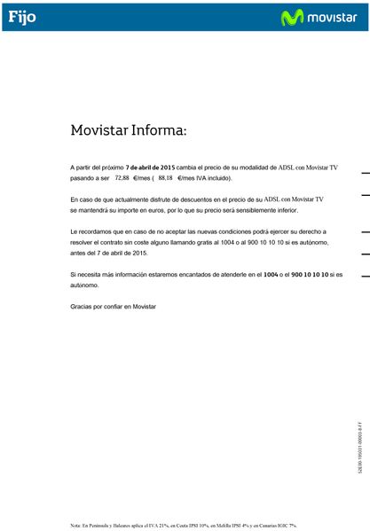 Hola pepe1900, deje progresivamente de ser cliente de telefónica cuando el Imagenio Familiar le "impusieron el futbol" con su subida correspondiente más la subida del IVA al 21% pasando de pagar 22€ a 36€ (octubre 2012), lo del IVA lo podía aceptar pero la subida por el futbol no, te puedo asegurar que aunque me costó (ya sebes toda la vida de telefónica) ahora estoy muy contento de ya no ser cliente de telefonica. Ahora tengo fibra 50/5 con todos los servicios + línea móvil con 200mts y 1,1 GB todo por 42,28 € precio final con IVA incluido y sin ningún problema, con la opción de fibra 200/200 y las mismas condiciones anteriores e incluso alguna mejor por 54,38. Al quitar la TV de Imagenio ya no la he vuelto a contratar… ahora veo la televisión a la carta por internet, estoy ahorrando mucho con mejores prestaciones en lo que realmente me interesa y en la compañía que estoy no me obligan "de forma indirecta" a pagar por lo que no quiero.