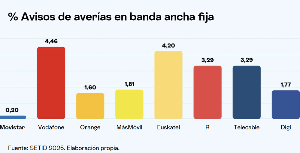 Uno de los indicadores más importantes para evaluar la calidad de un operador es el número de incidencias. En este aspecto, Movistar destaca al registrar el menor porcentaje de avisos de avería en banda ancha fija: solo un 0,20 %.