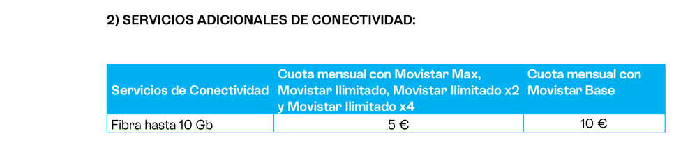 Como adelantaron desde BandaAncha, los 10 Gbps llegan inicialmente como un extra que el cliente puede añadir en los paquetes de conectividad de las tarifas miMovistar. El coste de aumentar a 10 Gbps es de 10€ en miMovistar Base, que tiene 600 Mbps, y de 5€ en el resto de tarifas que traen 1 Gbps.
