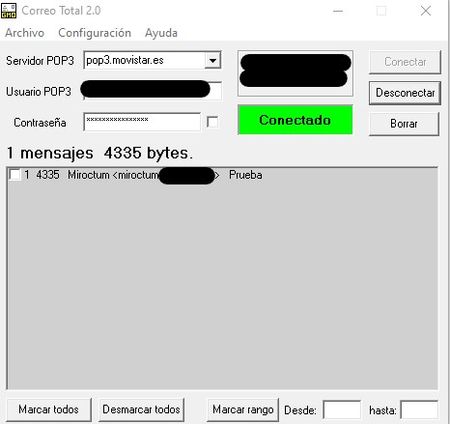 Una vez puesto, pulsaremos en conectar y podremos ver la cantidad de correos recibidos, es importante destacar que para leer los correos es necesario un cliente de correo cualquiera o el webmail