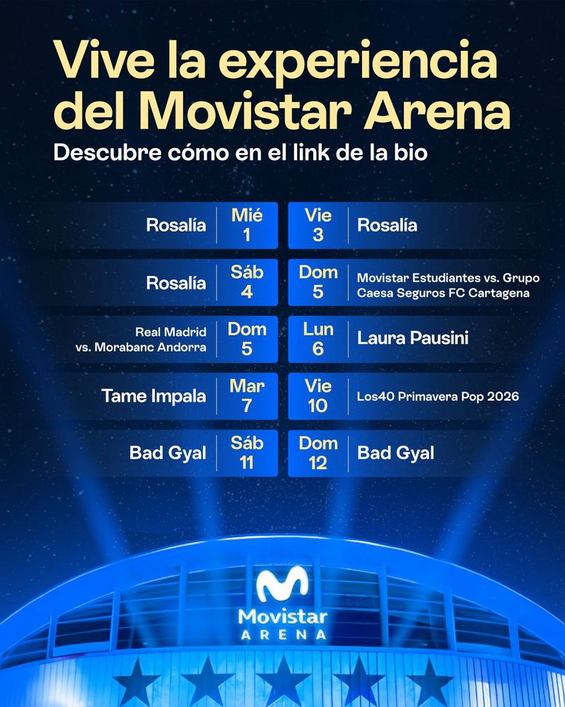 Música, deporte y espectáculos que lo llenan todo: desde Rosalía, Laura Pausini, Tame Impala, Los40 Primavera Pop 2026 o Bad Gyal, hasta el mejor baloncesto con el Real Madrid y el Movistar Estudiantes.
