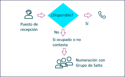- Como número de atención secundario cuando el número principal de la sede es un puesto de recepción. Para no perder llamadas, si esta línea está ocupada o no responde, las llamadas se envían a un número con Grupo de Salto que las reparte entre varias extensiones.