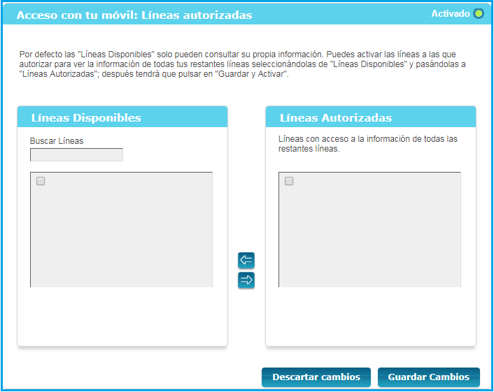 Aparecerá un listado de líneas disponibles y el administrador tendrá que elegir las líneas que quiere autorizar.