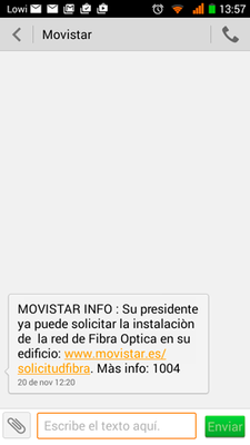 Esto es de chiste... El viernes pasado me llego este mensage al movil, de que ya puedo solicitar la instalacion de la fibra obtica, bueno mi presidente, pero supongo que seré yo, ya que vivo en u...