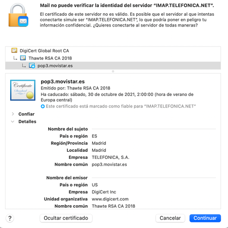 En Mail me aparece un aviso de error indicándome que el certificado pop3.telefonica está caducado. He tenido que ingresar al Webmail para poder acceder a todos mis correos recibidos desde esa fecha.