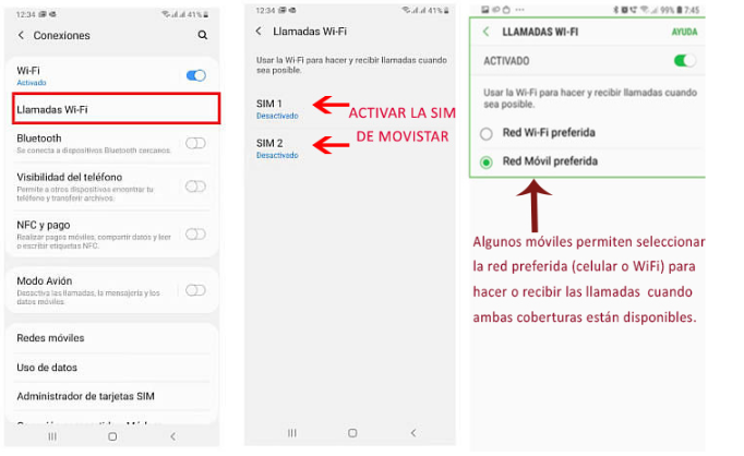 Android: Ajustes > Conexiones > Llamadas Wi-FI > Activar SIM donde desea activar el servicio (SIM 1 / SIM 2)