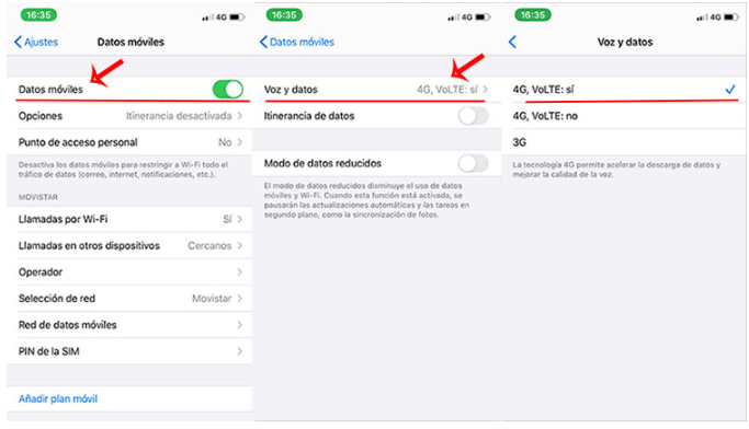 IOS: Ajustes > Datos Móviles > Voz y Datos > 4G, Volte: SI