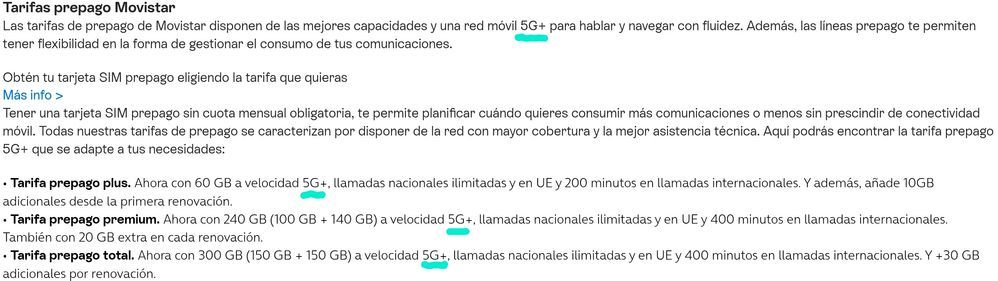 Gracias por su respuesta, ya me queda más claro todo. Sin embargo, lo que no termino de comprender es por qué, erróneamente, en la web de Movistar prepago (movistar.es/tarifas-moviles/prepago), se anuncia que las prepago incluyen datos a velocidad 5G+. Un saludo.