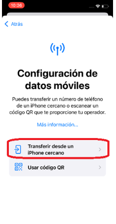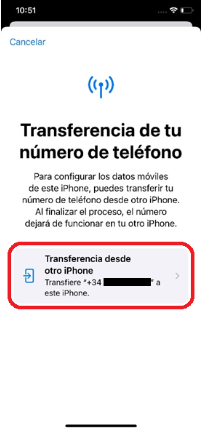 - Después de a ver confirmado este código en el IPhone Destino (Nuevo), en el IPhone Origen (Antiguo), nos mostrara la información de la línea que vamos a transferir, de tal forma que seleccionamos la opción de "Transferencia desde otro iPhone" para continuar mientras que el iPhone Origen se mantiene a la espera durante el resto del proceso.