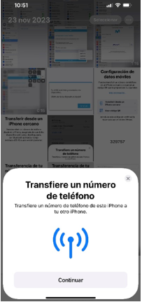 - Al notar que se ha finalizado la transferencia, nos aparecerá la siguiente pantalla que nos solicita confirmar la información de la línea que vamos a transferir (a partir de ahora, ya todas las pantallas que se muestran son en el iPhone Destino (Nuevo).