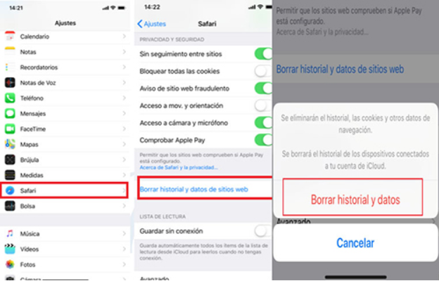 - Desde Ajustes / Safari / Borrar historial de navegación y datos de sitios web.