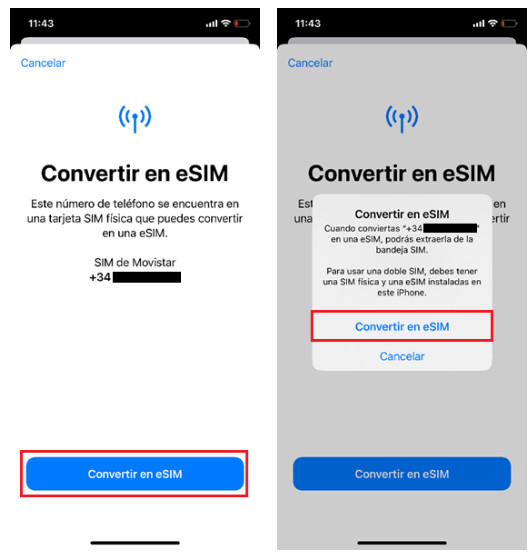 Una vez seleccionada la opción "Convertir en eSIM", se abrirá una pantalla indicando la información de la línea que se va a pasar a formato eSIM. Volvemos a pulsar en Convertir en eSIM