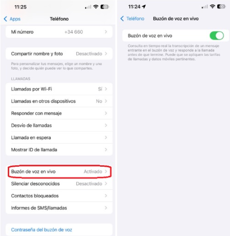 Ajustes - Apps - Teléfono - Buzón de Voz en Vivo.