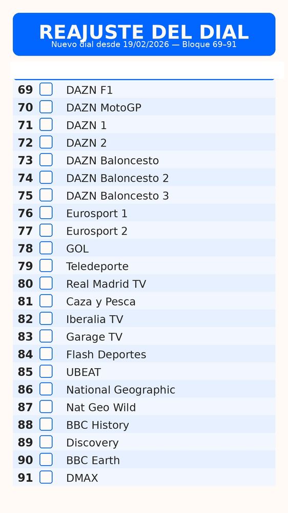 Este cambio afectará al rango de diales del 69 al 91, facilitando una navegación más lógica, intuitiva y unificada para todos los usuarios.