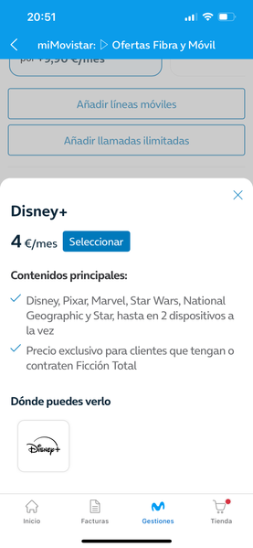 He intentado añadir a mi paquete ficción total el canal Disney+, siguiendo las instrucciones de la aplicación Mi Movistar y también en la web. Al llegar al final de la operación el sistema me devuelv...