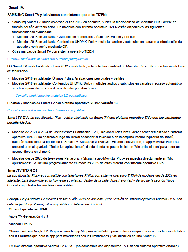 Para todos aquellos otros que no figuren en la siguiente relación (NO compatibles), deberán conectarse a un dispositivo HDMI (Otros dispositivos HDMI) compatible con Movistar Plus+ y que también aparecen en la parte final del mencionado listado