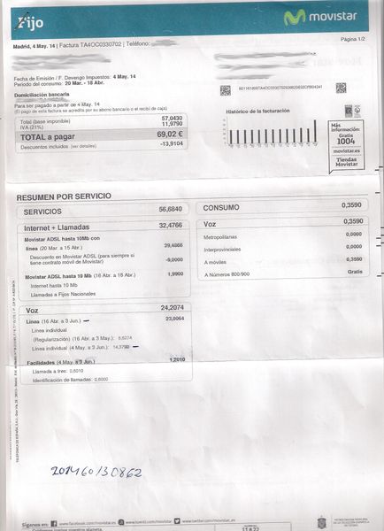 Te comento que el importe cobrado es porque Movistar cobraba en un paquete Adsl y Línea Fija, y ahora va acobrar los conceptos por separado y el alquiler de Línea un mes por adelantado, éste importe se le devuelve al cliente cuando causa baja.