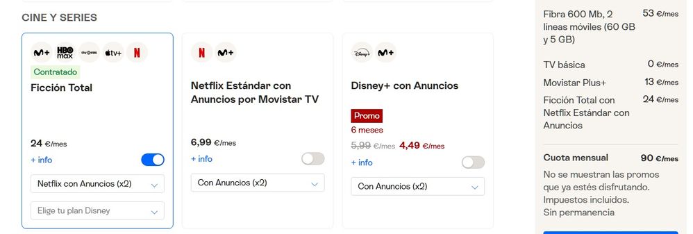 Entiendo que es un error y quisiera que me lo confirmaran que solamente me facturarán 53 €/mes de mimovistar, 13 €/mes de Movistar Plus+ y 5,24 €/mes durante 6 meses de Netflix con anuncios promocionado, servicios que son los que disfruto y los incluids en ficción total con Netflix estándar.