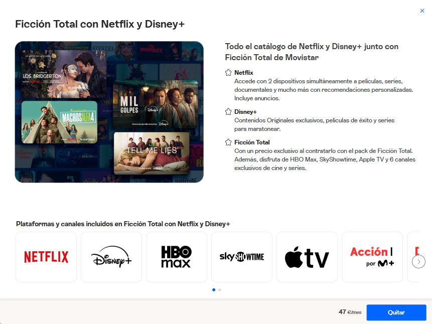 Es decir, establecer como preferentes aquellos otros contenidos de Noticias, Documentales, Series, Cine y las diferentes Plataformas de Streaming. Posibilidad accesible, contratando desde Movistar Plus+ este otro Pack TV, y completar de esa forma el Pack TV (Esencial) Movistar Plus+ (+14 €/mes) los Canales y Contenidos ya incluidos con este último Pack.