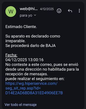 A las semanas me mandan un correo electrónico que dice que el TV no se puede reparar y ha sido dado de baja sin más explicación ni instrucciones de que debo hacer.