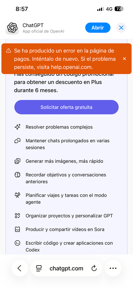 Al intentar activarla aparece el error “Se ha producido un error en la página de pagos”, tanto en iOS app como en navegador.