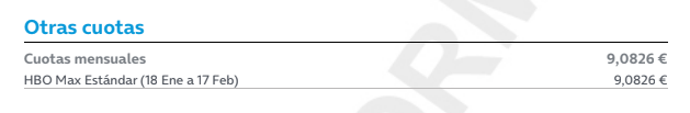 Acabo de ver la última factura recibida hace pocos días y me aparé un cobro por HBO Max Estándar (18 Ene a 17 Feb) 9,0826 € +IVA que en la anterior factura no aparecía y nadie lo ha contratado.