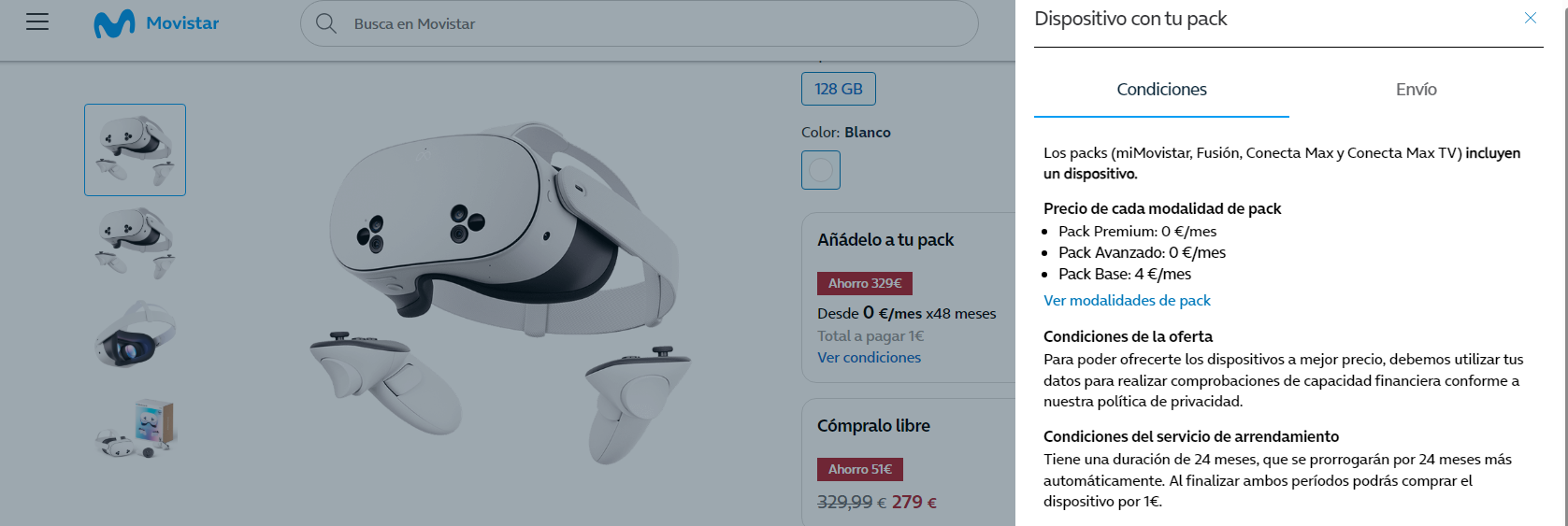A ver que no entiendo esto. Hace 4 años pedi un dispositivo con mi pack movistar , que era una tv xiaomi de 55 pulgadas , por la que he estado pagando no se si eran 5 o 6 euros al mes. Bueno, la cosa es que se acaba el contrato del pago de dispositivo el dia 5 de Octubre. Entonces me estan diciendo que puedo elegir un nuevo dispositivo y me interesan las gafas de RV Meta Quest 3s . Segun pone en la web ( y adjunto foto) salen a 0 euros al mes , renovando mi dispositivo pero al darle a añadir , en la siguiente pagina sale que tengo que pagar 4 euros al mes si lo hago ya y acabar de pagar la tv Xiaomi , que son unos 17 euros. Entonces tengo varias preguntas: 1ª; porque me dice 0 euros/ mes ( foto) y despues y al hacer el pedido me dice 4 euros. 2ª: Si me espero al dia 5 de Octubre , puedo quedarme la TV por 1 euro y despues puedo pedir un nuevo dispositivo ( las gafas) por 0 (o 4) euros al mes o eso ya no se considera renovacion? 3ª Para que sea renovacion , debo de hacer el pedido del nuevo dispositivo antes de que cumpla el plazo de la TV , aunque tenga que pagar lo que resta de la TV? Expliquenmelo un poco , por favor. Gracias