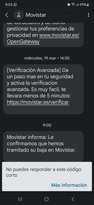 Buenos días, hoy 06/05/25 he recibido este mensaje SMS (ver foto adjunta) desde el número oficial de Movistar: No he solicitado baja de nada. No pone ninguna referencia, ni especifica cual servicio...