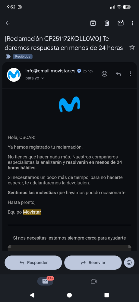 [Reclamación CP251172KOLL0V/0] Te daremos respuesta en menos de 24 horas