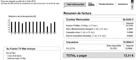 De todos modos, y por la imagen de la factura que envías, veo que además de la cuota de Fusión se te cobran las de otros servicios que tienes contratados: mantenimiento integral, llamada a tres y desvío inmediato. Sin estos servicios, la cuota de Fusión TV Más sería de 65 euros con el IVA incluido.