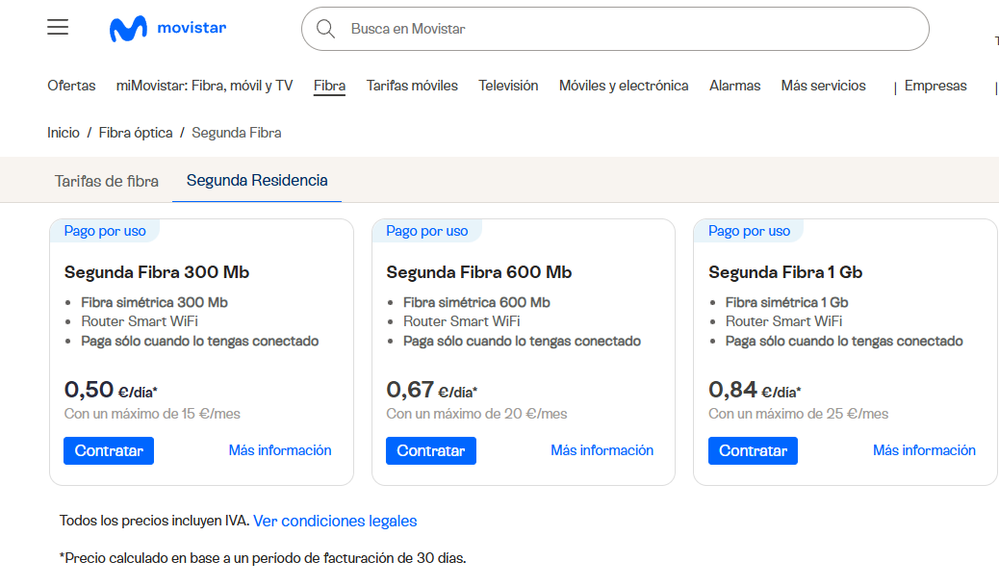 Estoy viendo como poner internet en mi residencia de vacaciones. Había leído sobre un producto llamando segunda fibra (https://www.movistar.es/fibra-optica/segunda-residencia/segunda-fibra-600-mb/), combustible con ni tarifa miMovistar, que permite encender y apagar el servicio a demanda. Es como un cobro por día de uso. Pero veo que ya no se puede contratar, siendo la alternativa otro llamado "Fibra adicional", que no permite el on/off y, eso sí, que no tiene permanencia.