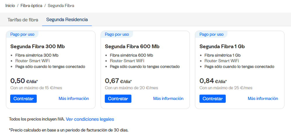 Además, entrando en MiMovistar, veo que el producto al cuál me han cambiado es segunda fibra + fijo en lugar de segunda residencia como viene indicado como opción para contratar en la web. Esta segunda fibra con opción de apagar y encender no es lo que quiero, quiero el producto de segunda residencia completo con el futbol integrado.