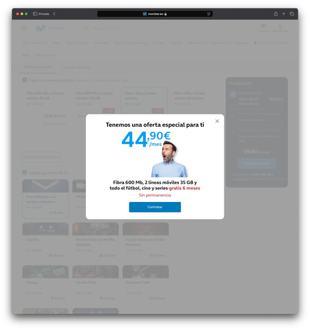 Buenas tardes, el mes pasado me di de alta con Movistar por la web acogiéndome a una oferta que decía que tendría Fibra 600 mb, 2 lineas móviles y TV: (Todo el fútbol, cine y series gratis durante ...