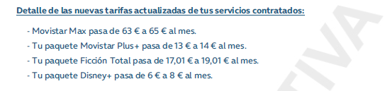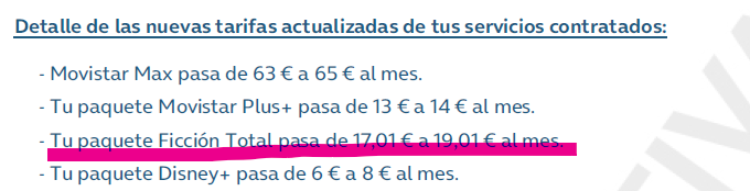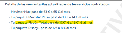 Lo que no entiendo si la subida será de 5€ o 7€, pues de Movistar Ficción Total (si actualmente descontamos Disney y Netflix) ya estamos pagando los 19€. (En el anexo pone que pasaremos de 17€ a 19€).