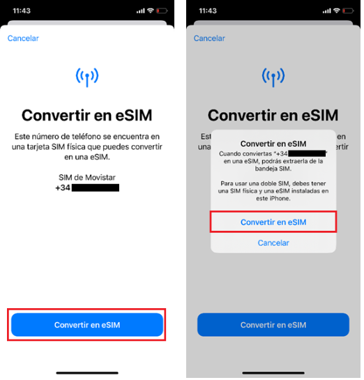 - Una vez seleccionada la opción "Convertir en eSIM", se abrirá una pantalla indicando la información de la línea que se va a pasar a formato eSIM. Volvemos a pulsar en Convertir en eSIM.