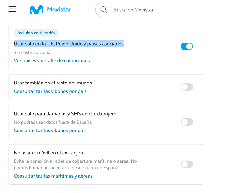 Pensé que se veía... es una captura del menú de roaming desde mi área de cliente de la web donde tengo activada la opción "Usar solo en la UE, Reino Unido y países asociados".