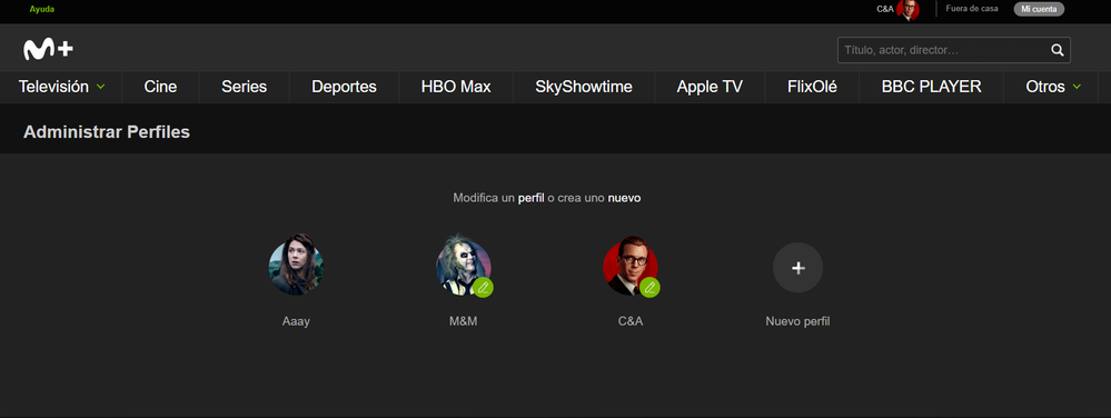 Procedi a llamar al 1004 y me cambiaron el usuario y contraseña, puse un correo diferente cambie la contraseña y entre de nuevo pero los perfiles salían exactamente igual. El perfil Aaay con esa foto que aparece en esta captura era antiguamente el perfil por defecto Hogar sin foto (repito es un perfil que no se puede editar)